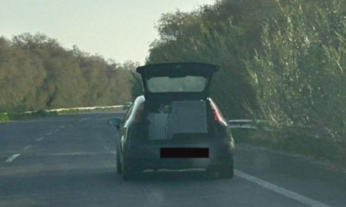 Μάλιστα το φορτίο, όχι απλά προεξέχει επικίνδυνα αλλά δεν διαθέτει και οποιαδήποτε πρόσδεση, μετατρέποντας τις συσκευές που κουβαλάει, σε ένα επικίνδυνο φορτίο, το οποίο ανά πάσα στιγμή μπορεί να φύγει και να χτυπήσει κάποιον ανυποψίαστο οδηγό που ακολουθεί.