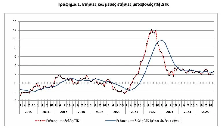 Ο μέσος δείκτης του δωδεκαμήνου Ιανουαρίου 2025 – Δεκεμβρίου 2025, σε σύγκριση με τον αντίστοιχο Δείκτη του δωδεκαμήνου Ιανουαρίου 2024 – Δεκεμβρίου 2024, παρουσίασε αύξηση 2,5%, έναντι αύξησης 2,7% που σημειώθηκε κατά την αντίστοιχη σύγκριση του δωδεκαμήνου Ιανουαρίου 2024 – Δεκεμβρίου 2024 με το δωδεκάμηνο Ιανουαρίου 2023 – Δεκεμβρίου 2023.
