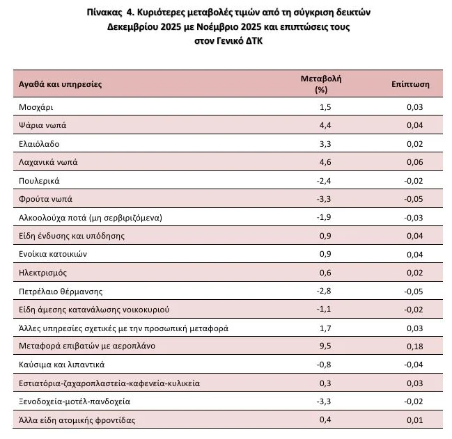 Η αύξηση του Γενικού ΔΤΚ κατά 2,6% τον μήνα Δεκέμβριο 2025, σε σύγκριση με τον αντίστοιχο Δείκτη του Δεκεμβρίου 2024, προήλθε κυρίως από τις μεταβολές στις ακόλουθες ομάδες αγαθών και υπηρεσιών: