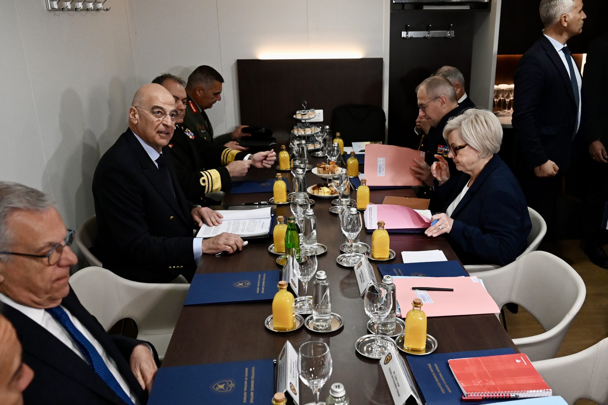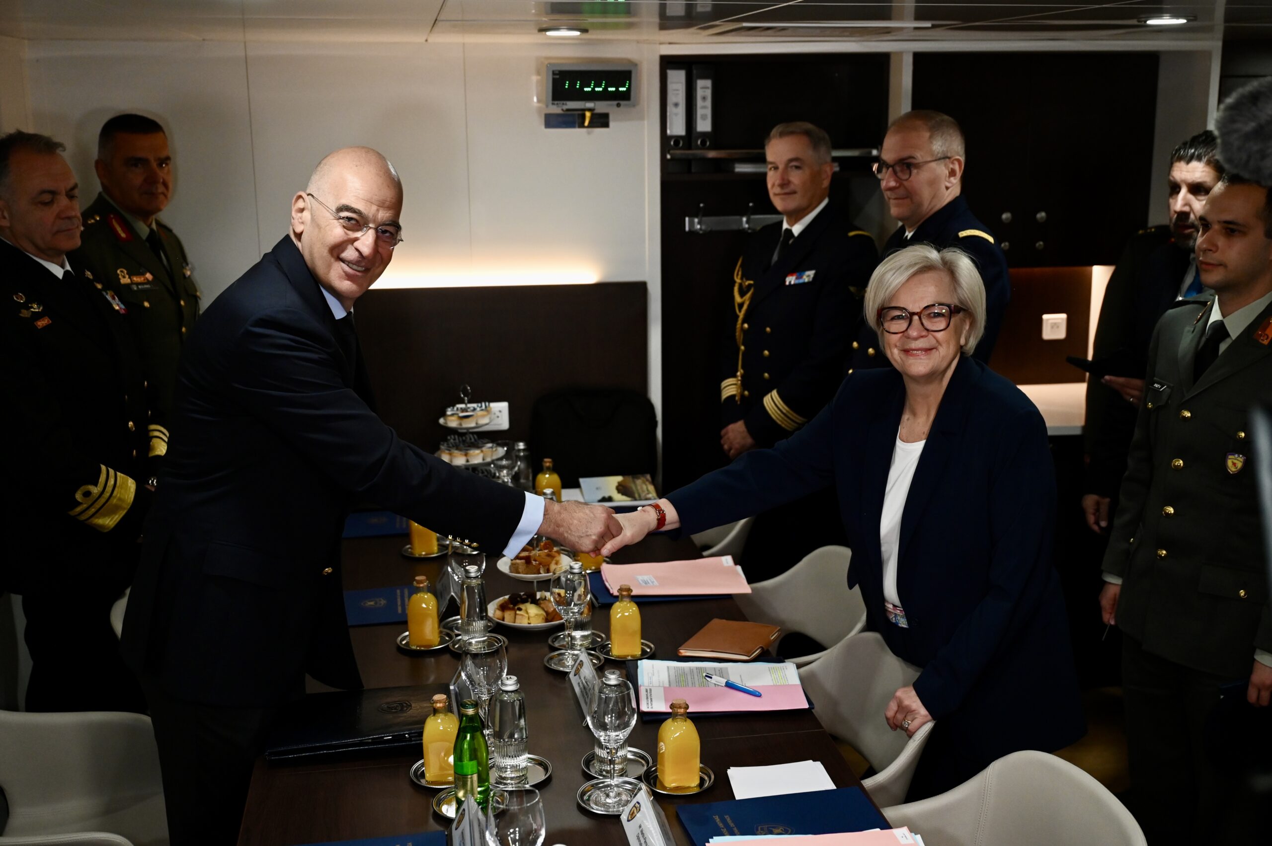 Ο Υπουργός Εθνικής Άμυνας, Νίκος Δένδιας, συναντήθηκε σήμερα, Σάββατο 25 Απριλίου 2026, με την Υπουργό Ενόπλων Δυνάμεων της Γαλλίας, Catherine Vautrin, επί της Φρεγάτας ΚΙΜΩΝ, στο πλαίσιο της επίσκεψης του Προέδρου της Γαλλικής Δημοκρατίας, Emmanuel Macron, στην Ελλάδα. Κατά τη συνάντηση, στην οποία συμμετείχαν επίσης ο Αρχηγός ΓΕΕΘΑ Στρατηγός Δημήτριος Χούπης, ο Αρχηγός ΓΕΝ Αντιναύαρχος Δημήτριος – Ελευθέριος Κατάρας ΠΝ και αντιπροσωπείες των δύο πλευρών, συζητήθηκε η περαιτέρω εμβάθυνση της αμυντικής συνεργασίας μεταξύ της Ελλάδας και της Γαλλίας, καθώς και οι εξελίξεις ασφάλειας στην ευρύτερη περιοχή.