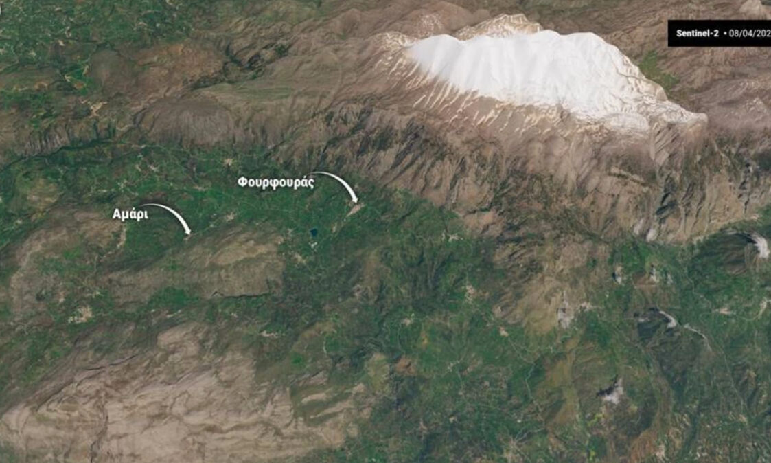 Οι ανέφελες συνθήκες στην Κρήτη την Μ. Τετάρτη 08/04 επέτρεψαν την δορυφορική αποτύπωση της χιονοκάλυψης στον Ψηλορείτη.