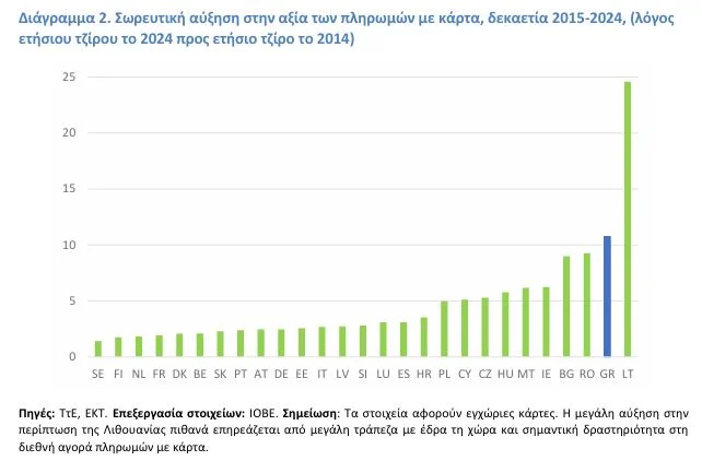 Τη δεύτερη ταχύτερη εξάπλωση της χρήσης καρτών στην ΕΕ των 27 σημειώνει η Ελλάδα τη δεκαετία 2015-2024, σύμφωνα με νέα μελέτη του Ιδρύματος Οικονομικών και Βιομηχανικών Ερευνών.