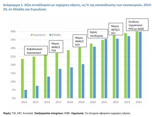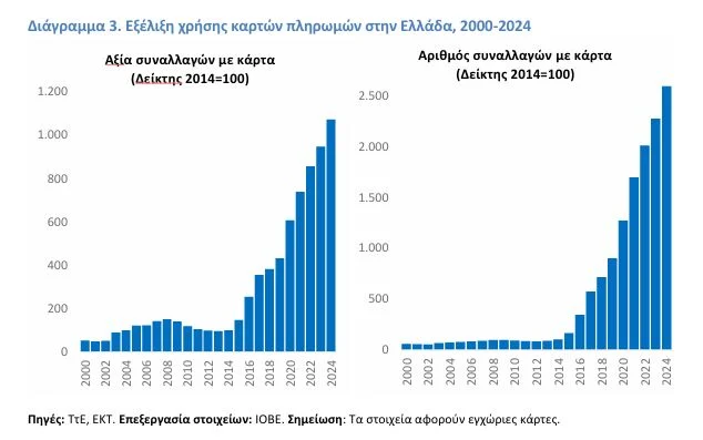 Όπως προκύπτει από τη μελέτη του ΙΟΒΕ, η χρήση καρτών έχει διευρυνθεί συστηματικά μετά το 2014, σε συνέχεια της επιβολής κεφαλαιακών περιορισμών, των μέτρων προώθησης των ηλεκτρονικών πληρωμών (νόμοι 4446/2016, 4646/2019, 4876/2021), της κρίσης πανδημίας, αλλά και διοικητικών μέτρων όπως η σύνδεση των τερματικών POS με την ΑΑΔΕ το 2024.