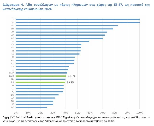 Παρά τη σύγκλιση αυτή, το επίπεδο χρήσης καρτών σε σχέση με την ιδιωτική κατανάλωση στην Ελλάδα παραμένει το 19ο χαμηλότερο μεταξύ των 27 μελών της ΕΕ, καθώς η χρήση καρτών παραμένει αναλογικά χαμηλή σε επιμέρους κατηγορίες συναλλαγών.