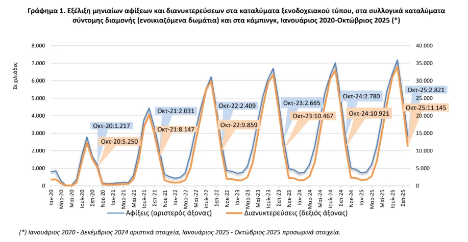 Τον Οκτώβριο του 2025 σε σύγκριση με τον αντίστοιχο μήνα του 2024, παρατηρήθηκε αύξηση 1,2% στις αφίξεις και 2% στις διανυκτερεύσεις των αλλοδαπών.