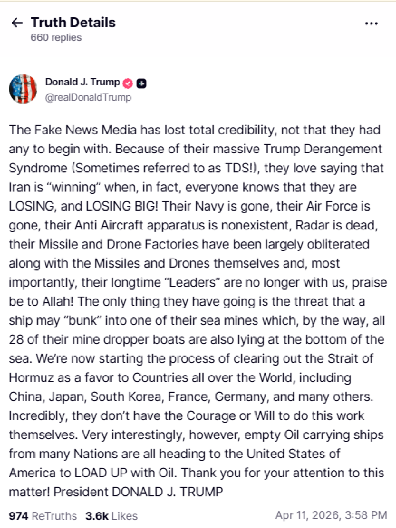 «Ο ψευδής ειδησεογραφικός Τύπος έχει χάσει κάθε αξιοπιστία, όχι ότι είχε ποτέ. Εξαιτίας του τεράστιου Συνδρόμου Παράκρουσης για τον Τραμπ, τους αρέσει να λένε ότι το Ιράν «κερδίζει», ενώ στην πραγματικότητα όλοι γνωρίζουν ότι ΧΑΝΕΙ!