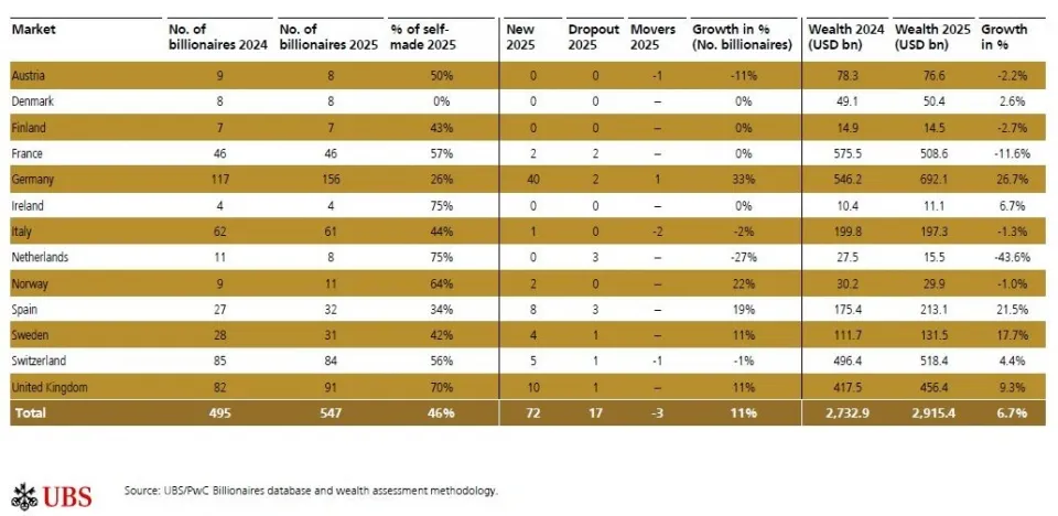Από αυτά, τα 386,5 δισ. δολάρια προήλθαν από συνολικά 196 αυτοδημιούργητους δισεκατομμυριούχους, σύμφωνα με την UBS.