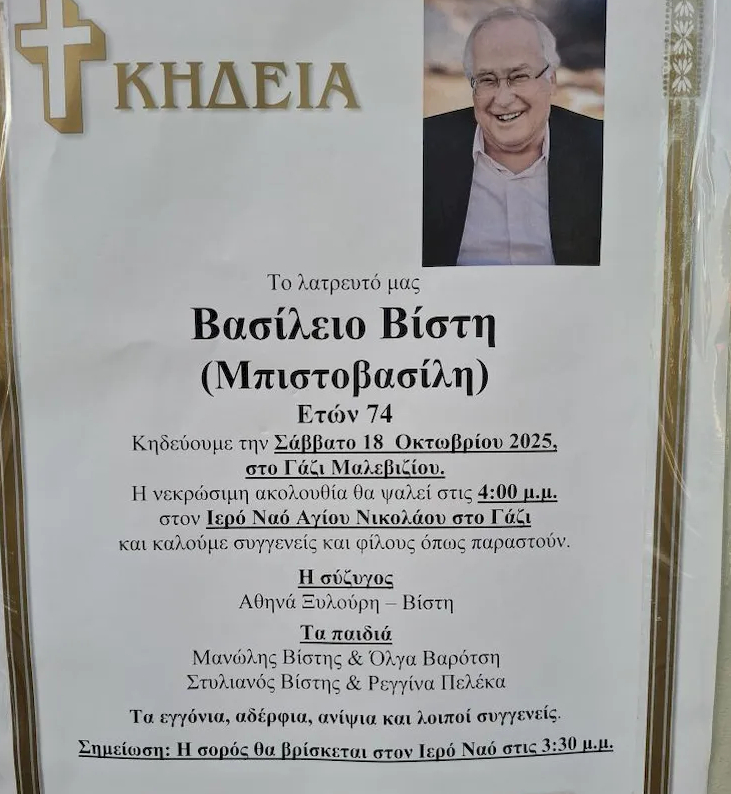 Βαρύ πένθος επικρατεί στο Ηράκλειο Κρήτης ο θάνατος του επιχειρηματία Βασίλειου Βίστη, πατέρα του αντιδημάρχου Μαλεβιζίου, Μανώλη Βίστη, ο οποίος έφυγε από τη ζωή σε ηλικία 74 ετών.