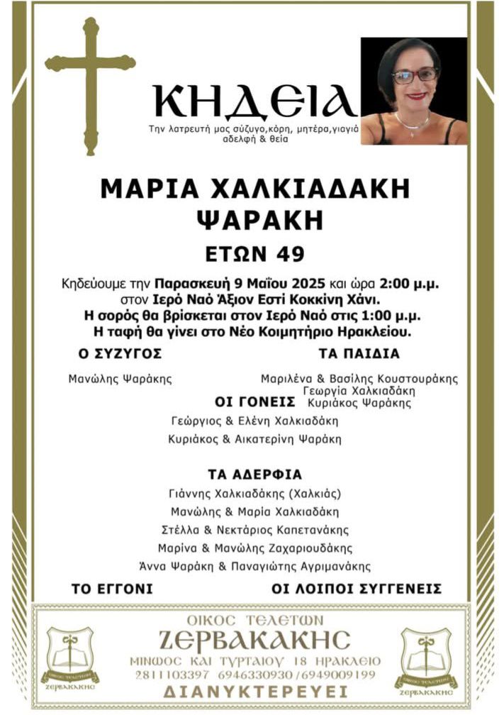 Στο πένθος βυθίστηκαν οι οικογένειες Χαλκιαδάκη και Ψαράκη στο Ηράκλειο, από τον πρόωρο θάνατο της αγαπητής Μαρίας.