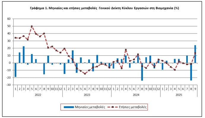 Ο γενικός δείκτης κύκλου εργασιών στη βιομηχανία του μηνός Σεπτεμβρίου 2025, σε σύγκριση με τον αντίστοιχο δείκτη του Αυγούστου 2025, παρουσίασε αύξηση 24,1%. Ο μέσος γενικός δείκτης του δωδεκαμήνου Οκτωβρίου 2024 – Σεπτεμβρίου 2025, σε σύγκριση με τον αντίστοιχο δείκτη του δωδεκαμήνου Οκτωβρίου 2023 – Σεπτεμβρίου 2024, παρουσίασε μείωση 0,2%, έναντι αύξησης 0,9% που σημειώθηκε κατά τη σύγκριση των αντίστοιχων προηγούμενων δωδεκαμήνων, αναφέρει το moneyriview.gr.