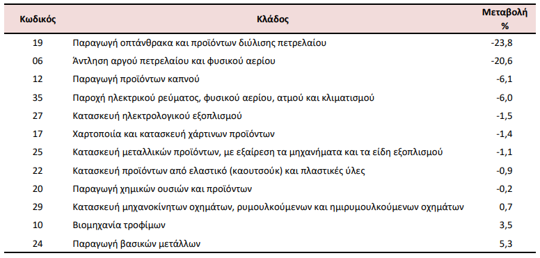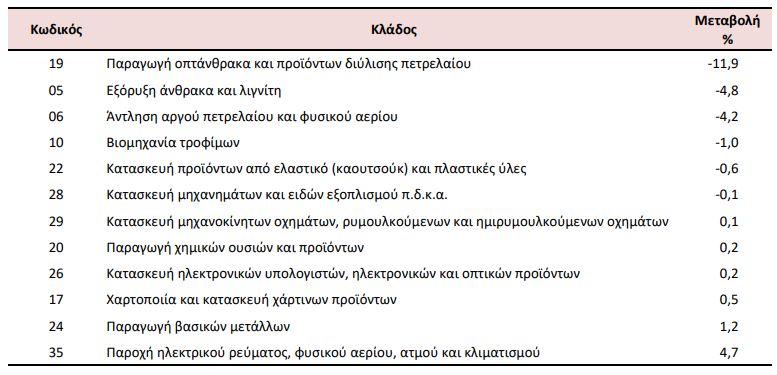Στη μείωση του Γενικού Δείκτη Τιμών Εισαγωγών (σύνολο αγοράς) κατά 5,4% συνέβαλαν κυρίως οι μεταβολές των δεικτών των διψήφιων κλάδων της ταξινόμησης NACE Αναθ. 2, ως εξής: