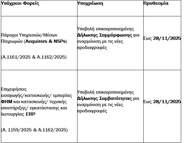 Περαιτέρω, καθορίζονται οι προθεσμίες συμμόρφωσης για τις εταιρείες τεχνολογίας και πληρωμών, ως εξής: